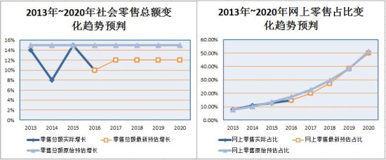 根據國家統計局數據,4年來,中國零售總額的增長雖較2012年之前的15%有所放緩,但仍保持著平均每年12%的增速;而網上零售總額占比雖然每年持續增長,整體上卻沒有預估數據那么理想。