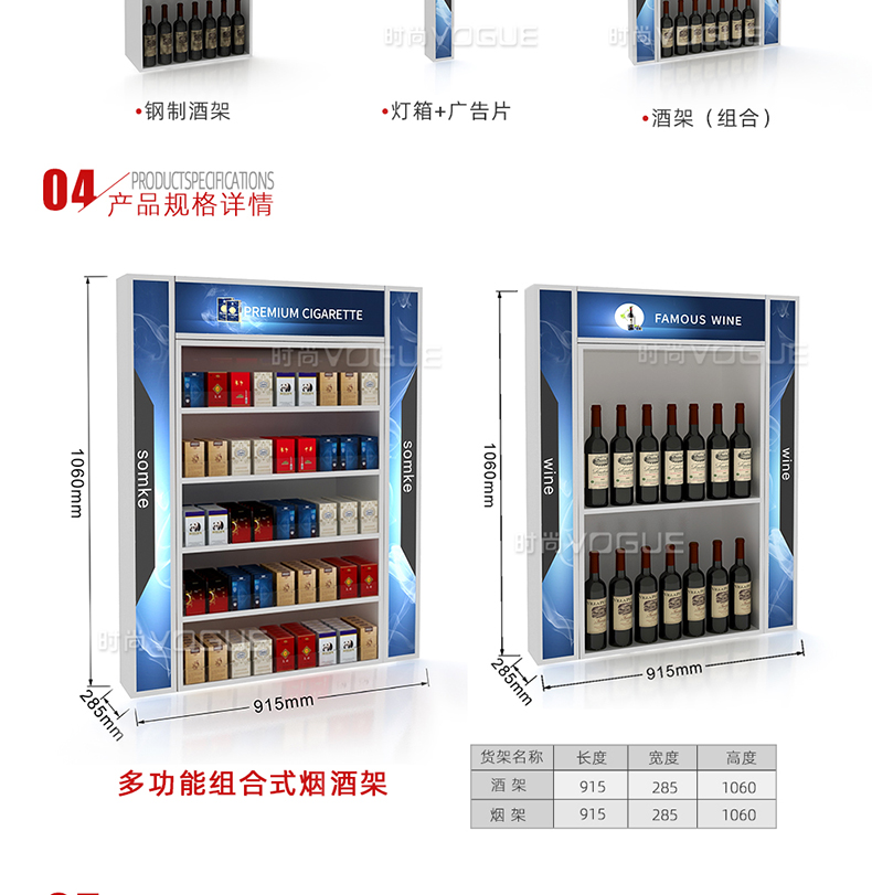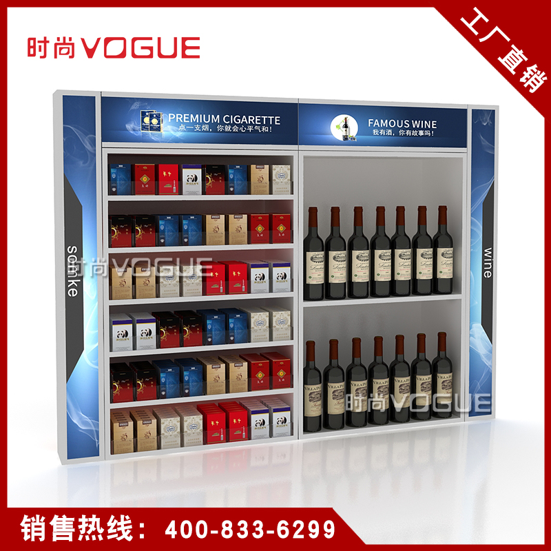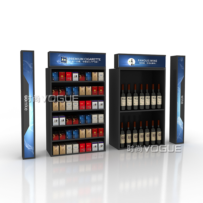 收銀臺紅酒架組合而成。便利店煙酒架立柱采用優質鋼材,具有很好的承重能力。頂部配有磁吸燈箱廣告牌,即可宣傳品牌,又可以指引顧客,讓整個收銀區的工作效率顯著提高。此款收銀區煙酒架是框架式結構,可以直接放置在收銀背柜上,穩定性和安全性很好。